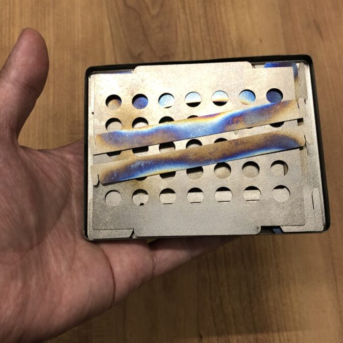 手の平サイズの極薄(板厚0.3㎜)、極軽(本体43g)チタン製ポケットストーブ(焚火台)です。